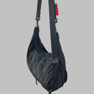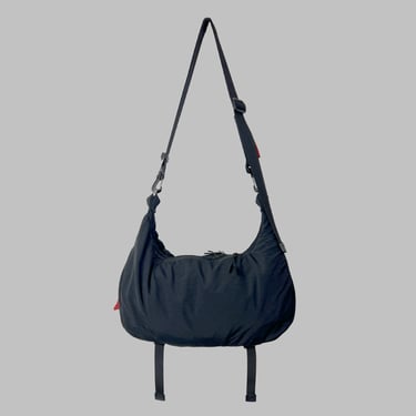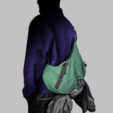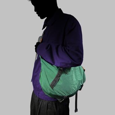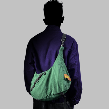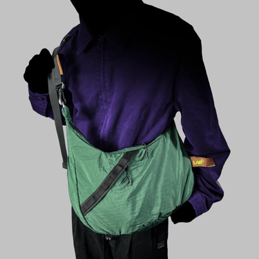 This lightweight sling bag is made from parachute fabric that is durable and water resistant. It features one main compartment with inner dividers to keep items organized, along with two additional spacious pockets for extra storage.