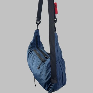 This lightweight sling bag is made from parachute fabric that is durable and water resistant. It features one main compartment with inner dividers to keep items organized, along with two additional spacious pockets for extra storage.