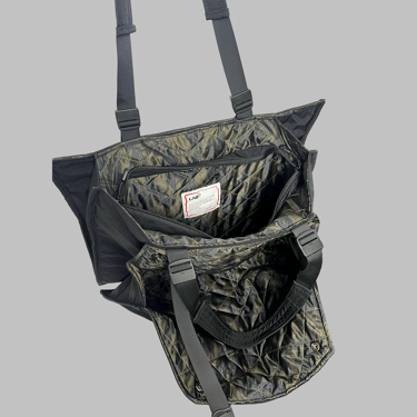 This tote bag features 3 spacious main compartments and is made from nylon crinkle. Its versatile design allows either side to be used as the front, depending on your preference. On the exterior, there are four additional pockets for storing items that need quick access.
